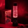 The 33cm (13″) tall plastic lamp is filled with flowing silver foil shapes and glitter. Turn the light on to watch the foil TIE fighter and X-wing shapes float around while casting a red, shimmering glow of their intergalactic battle across your room.