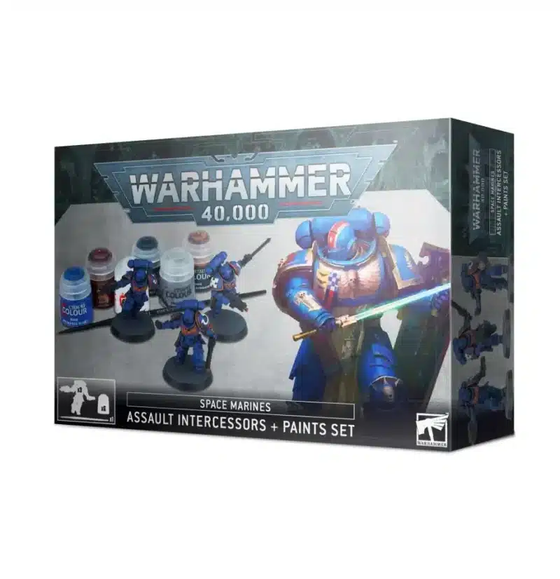 This box is the perfect way to start your collection of Primaris Space Marines. You’ll get three plastic Assault Intercessors with three distinct poses, the paints you need to prepare them for battle and a brush to get you started. These models are push fit, only requiring clippers to assemble – no glue, no mess.