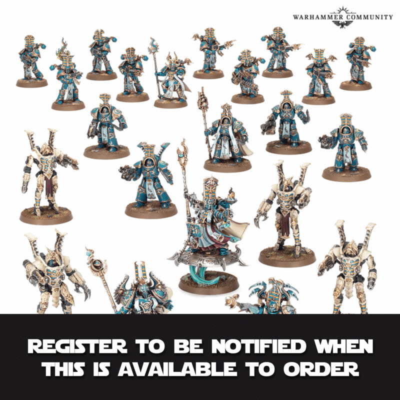 Sorcerers lead their cursed brothers into combat alongside warp-powered automata such as the eerily silent Sekhetar Robots, whose forms are inscribed with sigils of obscuration that keep them hidden until they unleash their arcane payload. The Warpflame Thrallband Battleforce contains three Exalted Sorcerers, five Scarab Occult Terminators, 10 Rubric Marines, and four brand new Sekhetar Robots, plus a Chaos Space Marine Transfer Sheet with 364 transfers. This set is available while stocks last.