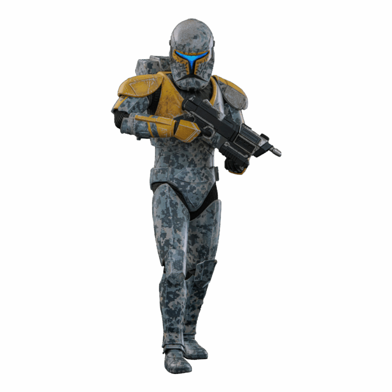 - One (1) finely crafted Clone Commando Gregor armor with yellow markings, gray camouflage details, and weathering effects