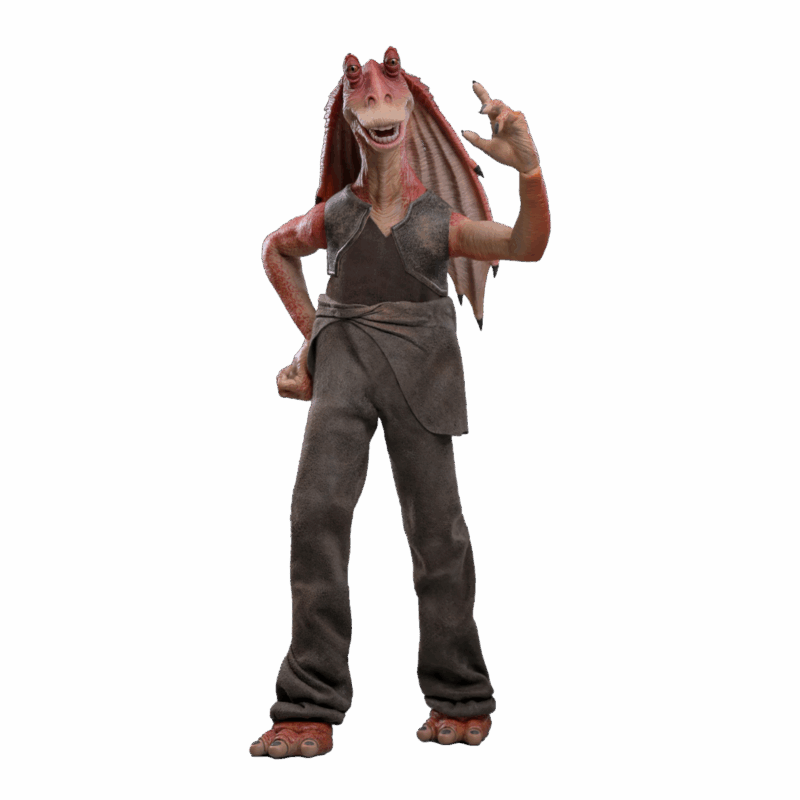 A clumsy, well-meaning Gungan outcast on Naboo, Jar Jar Binks struggled to prove his worth throughout his life. When Qui-Gon Jinn and Obi-Wan Kenobi first met Jar Jar Binks, Qui-Gon sensed their meeting was the will of the Force, and took the Gungan outcast with them to Tatooine and Coruscant. Qui-Gon was right: Jar Jar would prove an exasperating but important bridge between Naboo’s human settlers and their Gungan neighbors.