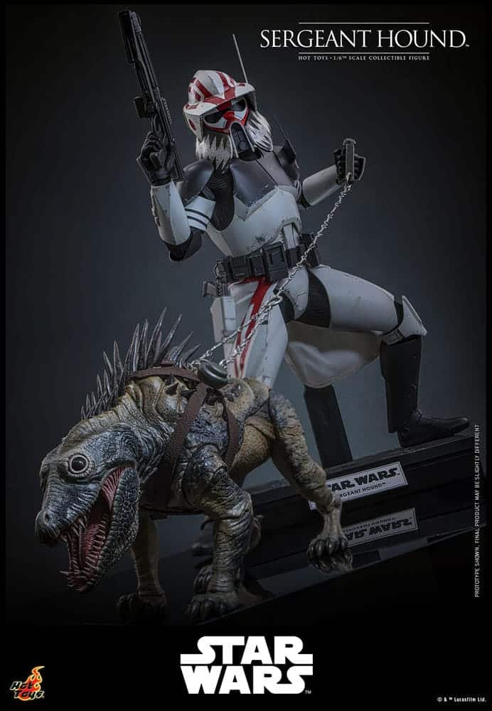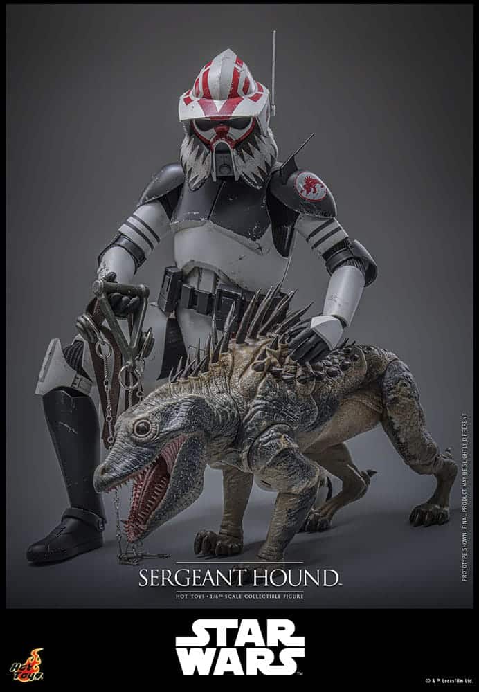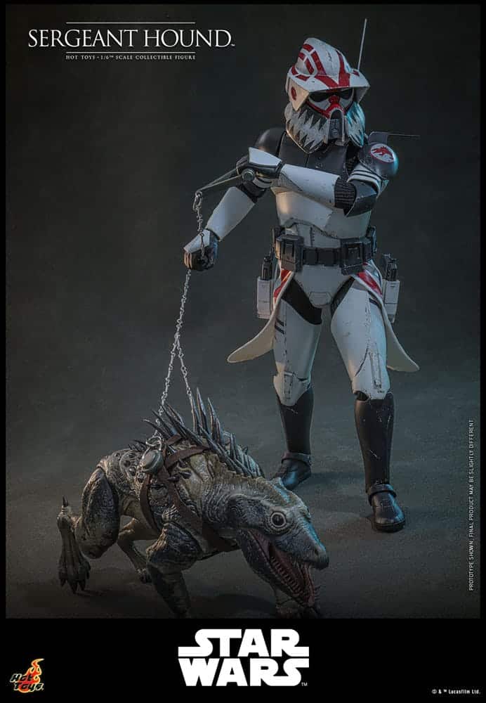 Sideshow and Hot Toys introduces the Sergeant Houndâ„¢ Sixth Scale Collectible Figure, capturing this unique duo in stunning detail. The Star Wars action figure features a finely crafted helmeted head sculpt with realistic weathering effects. Seven interchangeable hands, including relaxed, blaster-holding, leash-holding, and index finger pointing, offer versatile display options. His white and dark gray colored armor is meticulously recreated with red stripe details, complemented with a fabric undersuit, and battle-worn long boots. Armed with a blaster rifle and two blaster pistols, he’s fully equipped for Republic duty.