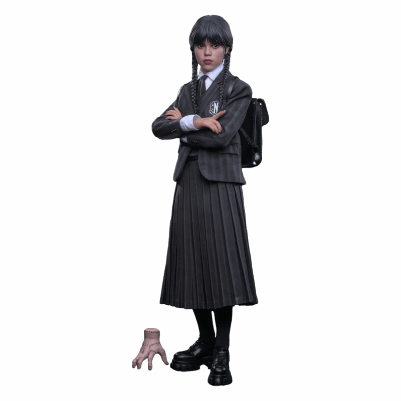 This screen-accurate action figure features a newly developed head sculpt with separate rolling eyeballs, meticulously crafted black hair sculpt with braided pigtails detail, and screen-accurate facial expression, skin texture, and makeup to capture Wednesday’s signature deadpan charm. The figure uses a newly developed body, standing approximately 27cm tall with 25 points of articulation, replicating her physique in the show. It comes with eight newly developed interchangeable hands for a variety of expressive poses, from her iconic finger snap to holding a range of different accessories. The sixth scale figure is dressed in the precisely tailored Nevermore Academy uniform, including a striped blazer with magnetic shoulder features, a sweater vest, a dress shirt, a tie, a striped pleated skirt, a pair of tights, and a pair of shoes.