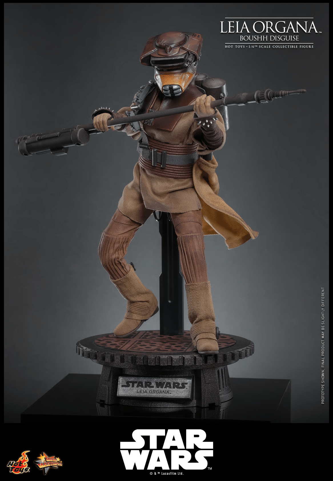 Sideshow and Hot Toys are proud to present the Leia Organa (Boushh Disguise)™ Sixth Scale Collectible Figure. The Star Wars action figure features a newly developed helmeted head with detailed weathering, as well as a separate unhelmeted head sculpt of Carrie Fisher as Leia, complemented by separate rolling eyeballs, a lifelike expression, and a meticulously sculpted low braided bun hairstyle.