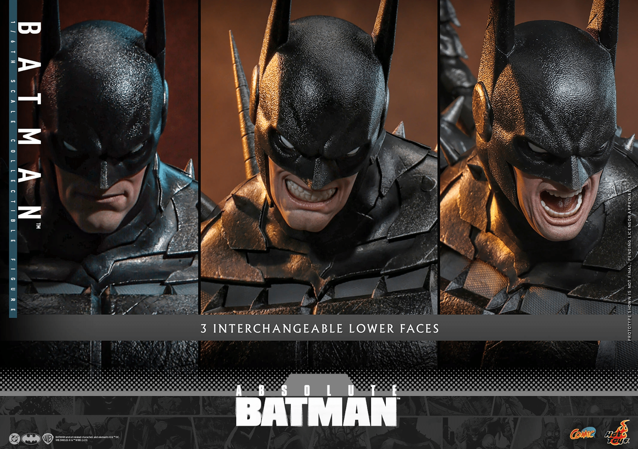 Sideshow and Hot Toys is thrilled to present the Batman™ Sixth Scale Collectible Figure, inspired by the Absolute Batman comic series. Standing at approximately 37 cm tall, this sixth scale figure brings the massively built Batman from the comics to life. It strikingly captures his powerful physique, featuring a muscular body made from soft vinyl materials that allow for a smooth, seamless joint design. The Batman action figure features a Batman cowl head with detachable bat ears and three interchangeable lower faces, allowing collectors to use his bat ears as knives and shift his expression from grim to outright menace.
