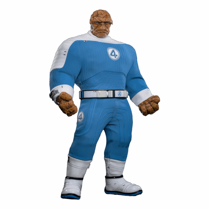 Sideshow and Hot Toys is proud to present the The Thing Sixth Scale Collectible Figure. The figure features a rock-like textured body. It also includes two interchangeable head sculpts, one normal version and one bearded version, both with rolling-eyeball function and texture that captures his iconic rock-like form. He wears the Fantastic Four uniform tailored in blue and white ribbed fabric, with the upper part of the suit being removable, allowing collectors to display The Thing in his classic bare-chested look. Completing the outfit is a belt bearing the Fantastic Four emblem and a pair of boots. The figure comes with six interchangeable hands, including fists, relaxed hands, and claw gesture hands for dynamic posing. Presented on a specially designed figure base, he’s ready to clobber!