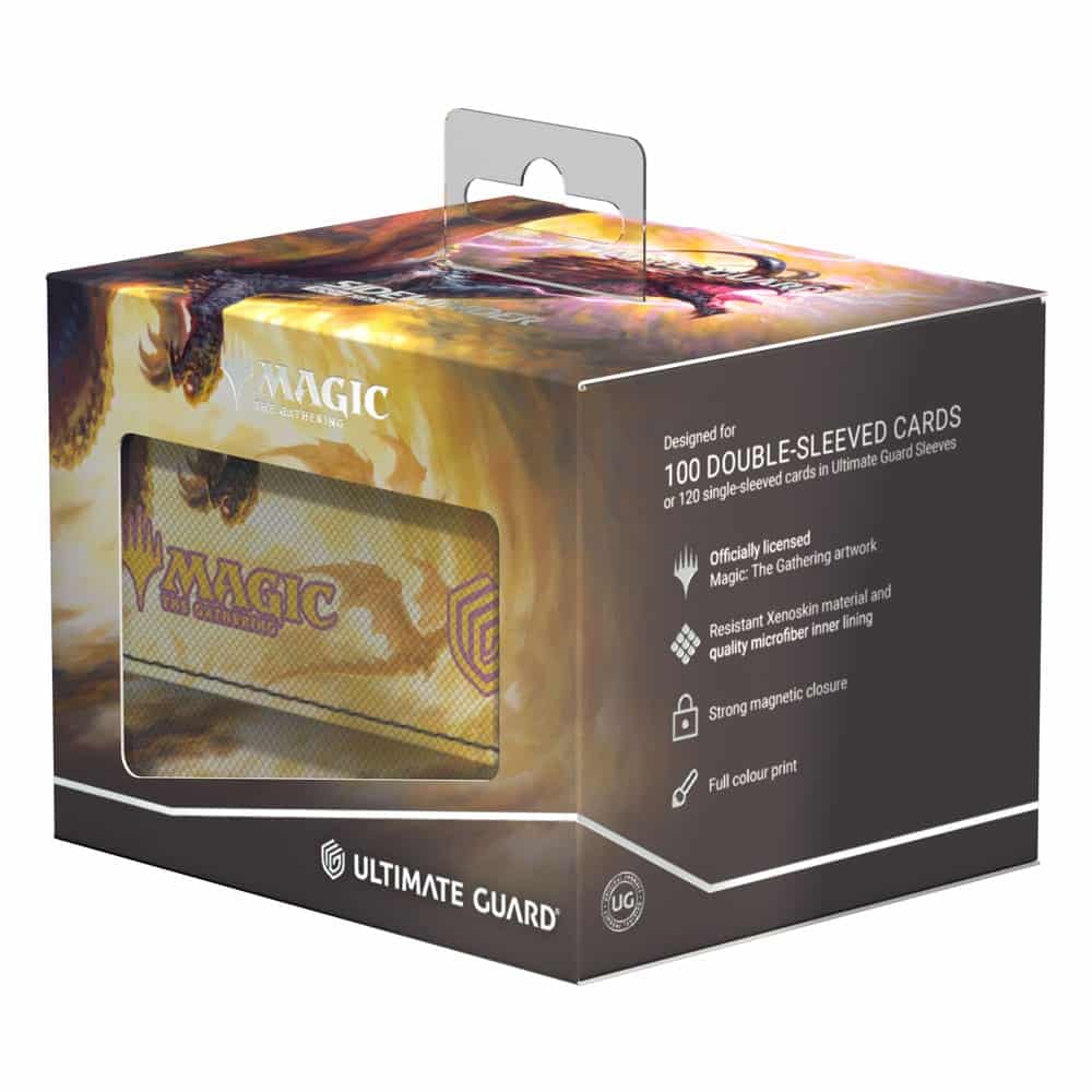The Special Edition Ghostfire Sidewinder 100+ Xenoskin, with a spectacular shimmering embossing on the microfiber interior, is printed with officially licensed artworks from Magic: The Gathering’s Tarkir: Dragonstorm set. This high-quality deck box, made from durable Xenoskin material with a reliable magnetic closure, holds up to 100 double-sleeved or 120 single-sleeved cards.
