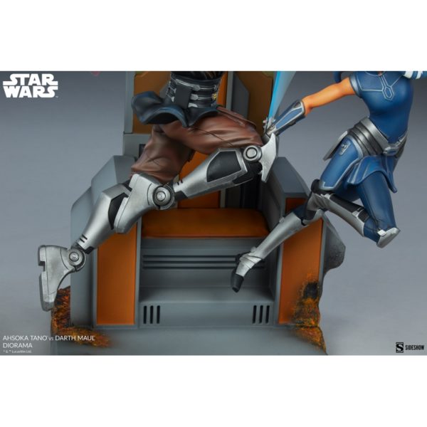 Inspired by their fateful confrontation in Star Wars: The Clone Wars, the Ahsoka Tano vs Darth Maul Diorama measures 20” tall and 14.55” wide, set against a Mandalore throne room environment base. Shattered windows and scorch marks on the throne set the scene of a high-octane battle in progress, as the ex-Padawan and former Sith go toe to toe in a graceful, skilful clash of Force-wielding ideals and lightsaber blades.