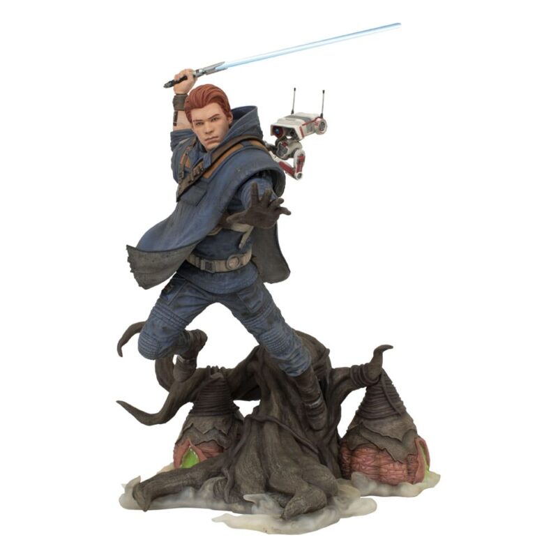 A Gentle Giant LTD release! A survivor of Order 66; Jedi padawan Cal Kestis spent years living on the run until his introduction in the game Star Wars Jedi: Fallen Order. Now, this 10-inch Gallery Diorama depicts him on the move, holding aloft his blue lightsaber while carrying BD-1 on his back! Featuring detailed sculpting and paint applications, including a translucent lightsaber blade, it is made of high-quality PVC and comes packaged in a full-color window box. Previously a GameStop exclusive.